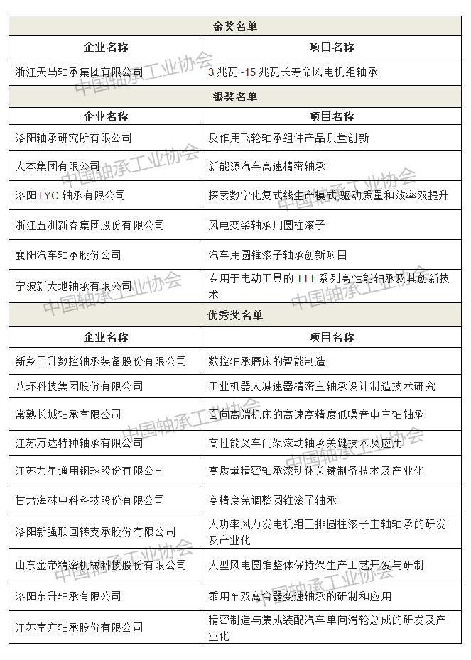 今年8月,中國機(jī)械聯(lián)合會(huì)下發(fā)了關(guān)于組織開展2021“華中數(shù)控”杯全國機(jī)械工業(yè)產(chǎn)品質(zhì)量創(chuàng)新大賽的通知,經(jīng)由30家協(xié)辦單位組織推薦和自行申報(bào),共收到400多個(gè)項(xiàng)目。經(jīng)大賽評(píng)審委員會(huì)線上初賽、專業(yè)復(fù)審、決賽評(píng)審,最終有167項(xiàng)產(chǎn)品質(zhì)量創(chuàng)新項(xiàng)目獲獎(jiǎng)。其中軸承行業(yè)多家企業(yè)產(chǎn)品質(zhì)量創(chuàng)新項(xiàng)目獲獎(jiǎng),其中金獎(jiǎng)1項(xiàng),銀獎(jiǎng)6項(xiàng),優(yōu)秀獎(jiǎng)9項(xiàng),公司“高精度免調(diào)整圓錐滾子軸承”產(chǎn)品榮獲優(yōu)秀獎(jiǎng),獲獎(jiǎng)名單分別如下: